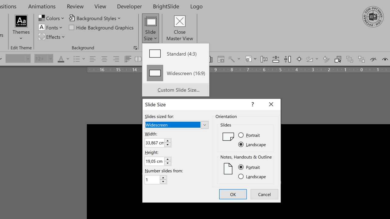 <img src="https://imagedelivery.net/phxEHgsq3j8gSnfNAJVJSQ/node3_57b3f50e-27d2-4d2f-92d1-796d006398c0/public" style="background-color:initial;max-width:min(100%,1280px);max-height:min(720px);;background-image:url(https://imagedelivery.net/phxEHgsq3j8gSnfNAJVJSQ/node3_57b3f50e-27d2-4d2f-92d1-796d006398c0/public);height:auto;width:100%;object-fit:cover;background-size:cover;display:block;" width="1280" height="720"> To change the slide size, go to the <b><span style="font-family: 'Avenir-Heavy'">View</span></b> tab, click <b><span style="font-family: 'Avenir-Heavy'">Slide Master,</span></b> then click <b><span style="font-family: 'Avenir-Heavy'">Slide Size</span></b> and choose <b><span style="font-family: 'Avenir-Heavy'">Custom Slide Size…</span></b> ~ <a class='tag' href="/tags/powerpoint">#powerpoint</a> <a class='tag' href="/tags/howto">#howto</a> <a class='tag' href="/tags/2k20">#2k20</a>